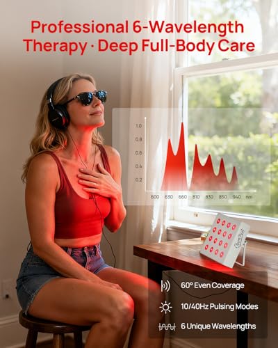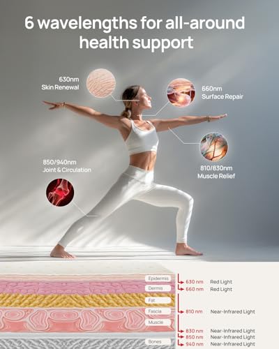 Red Light Therapy Panel for Body – 6‑Band Full‑Spectrum Benefits: Combines 630 nm, 660 nm, 810 nm, 830nm, 850 nm and 940 nm LEDs to penetrate multiple tissue layers, soothe muscle tension, boost circulation, and revitalize skin with red light and near infrared light therapy.