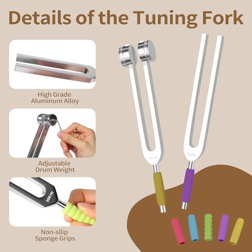 【Handle with Comfortable Sponge Grip】Each tuning fork features an extra-long handle paired with a soft sponge grip, ensuring superior comfort even during prolonged use. The colorful grips not only look beautiful but also provide a better hold on the tuning fork.