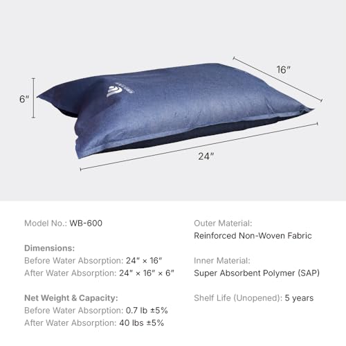 WEIBAO Standard Tech Sandbags – 5 Pack (24″ x 16″), Dark Blue | WB-600-A | Water-Activated Flood Barriers, Sandless Sandbags, Absorbent Water Blocker