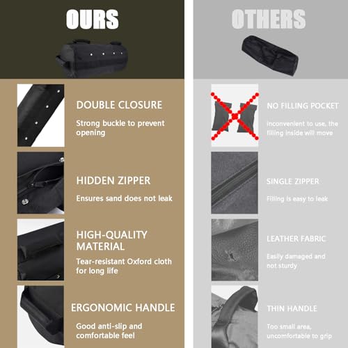 SANDBAG MATERIAL – The weight bag is made of highly tear-resistant Oxford fabric, with double-layer closure, the bags are extremely robust and ensure that the sand does not leak. The sandbag can be washed and used for life. The sandbag set is easy to store when not in use and takes up little space.