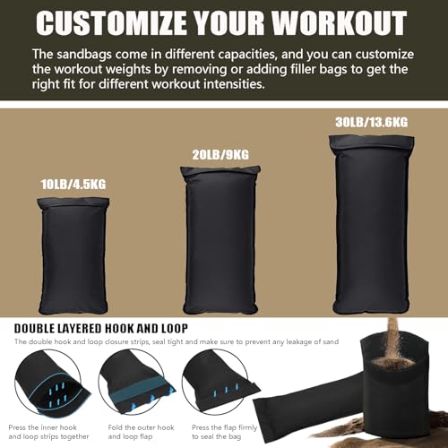 ADJUSTABLE WEIGHT – With 3 sandbags (10lb, 20lb, and 30lb), sandbags are available in different capacities you can customize the workout weight by removing or adding filler bags to get different strengths between 10 and 60 pounds for different fitness levels.